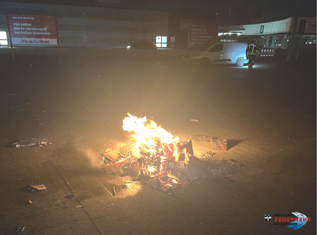 Beim Eintreffen der Einsatzkräfte brannten auf dem Parkplatz aufgeschichtete Kartonagen sowie Abschussrampen von Feuerwerkskörper.