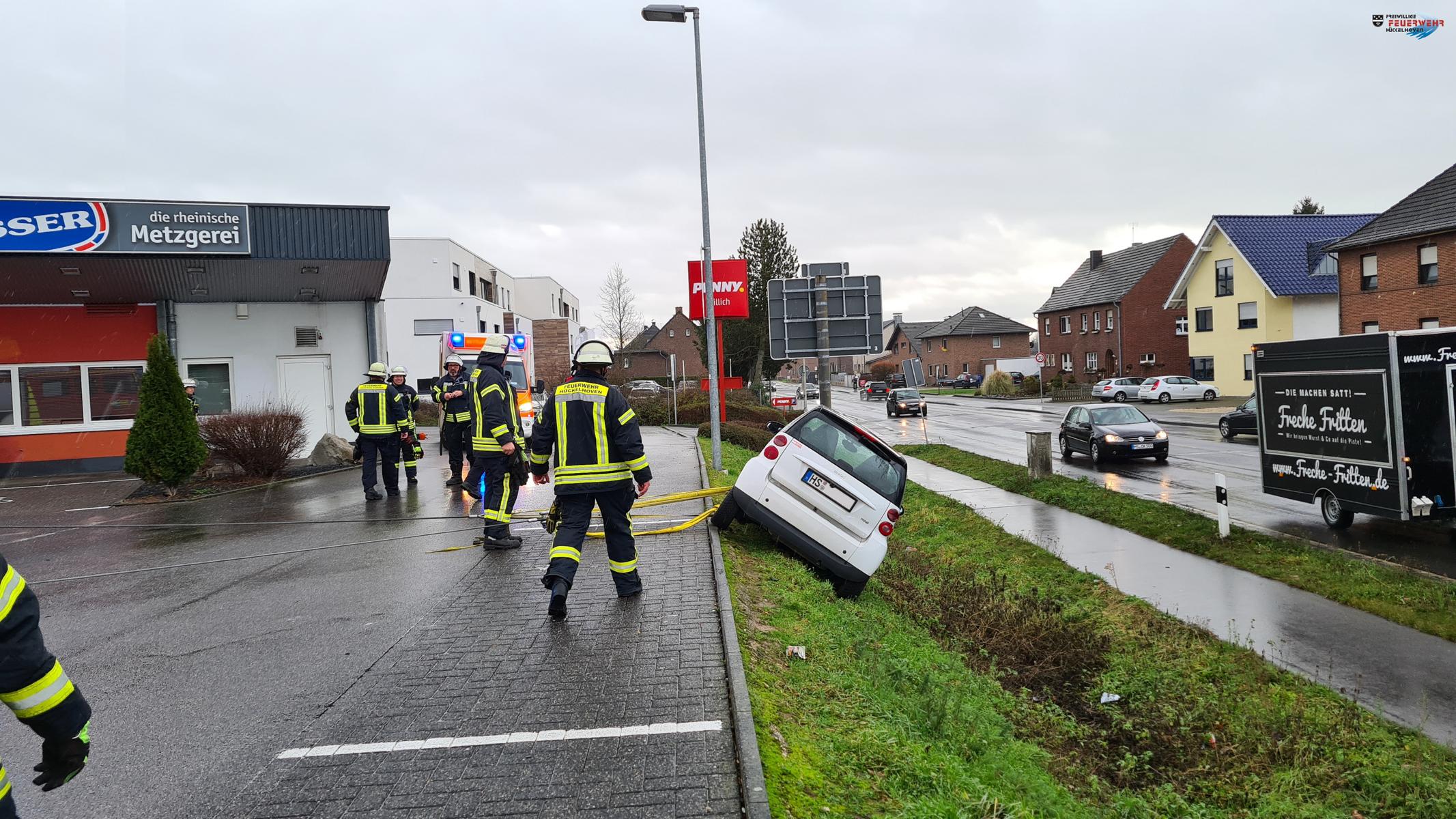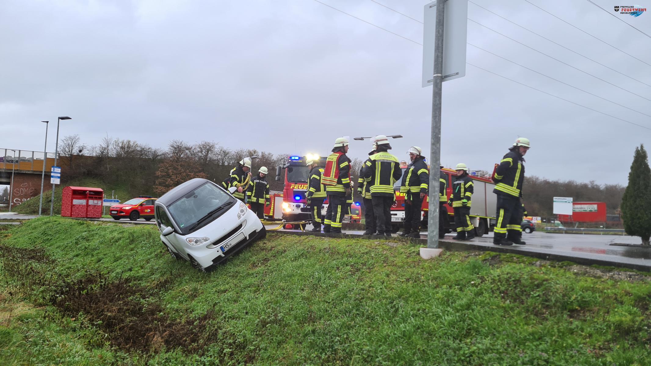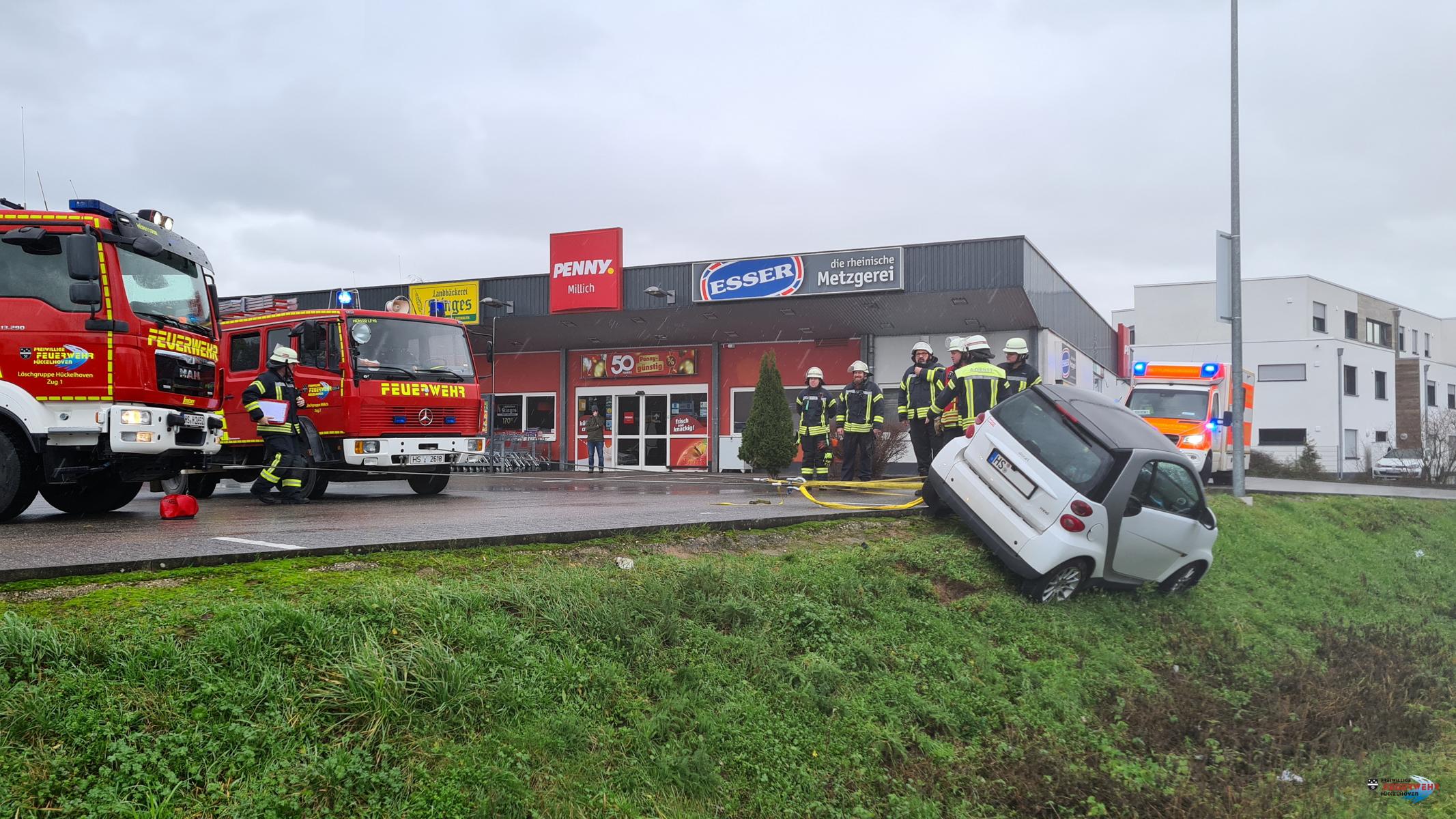 Die Feuerwehr wurde heute Vormittag gegen 11:30 Uhr zu einer Hilfeleistung nach Millich auf die Gronewaldstr. alarmiert. Auf dem Parkplatz eines Lebensmittel Discounters war aus ungeklärten Gründen ein Fahrzeug in den abschüssigen Hang gefahren und drohte umzustürzen.