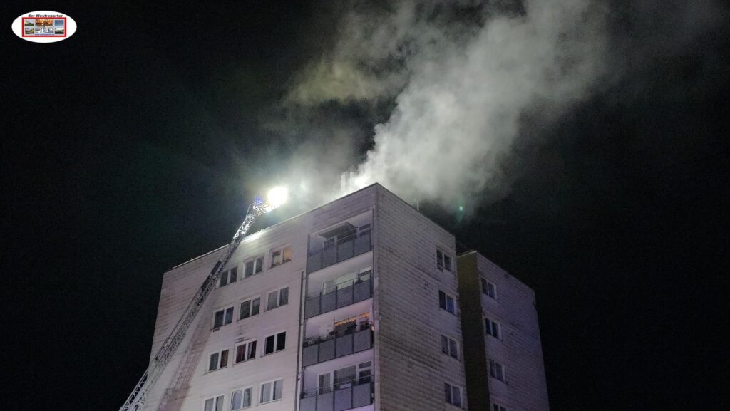 Aufgrund der Notrufmeldungen sowie der Objektinformation das das Mehrfamilienhaus über neun Stockwerke verfügt, wurden zahlreiche Einsatzmittel von Feuerwehr und Rettungsdienst in Marsch gesetzt.