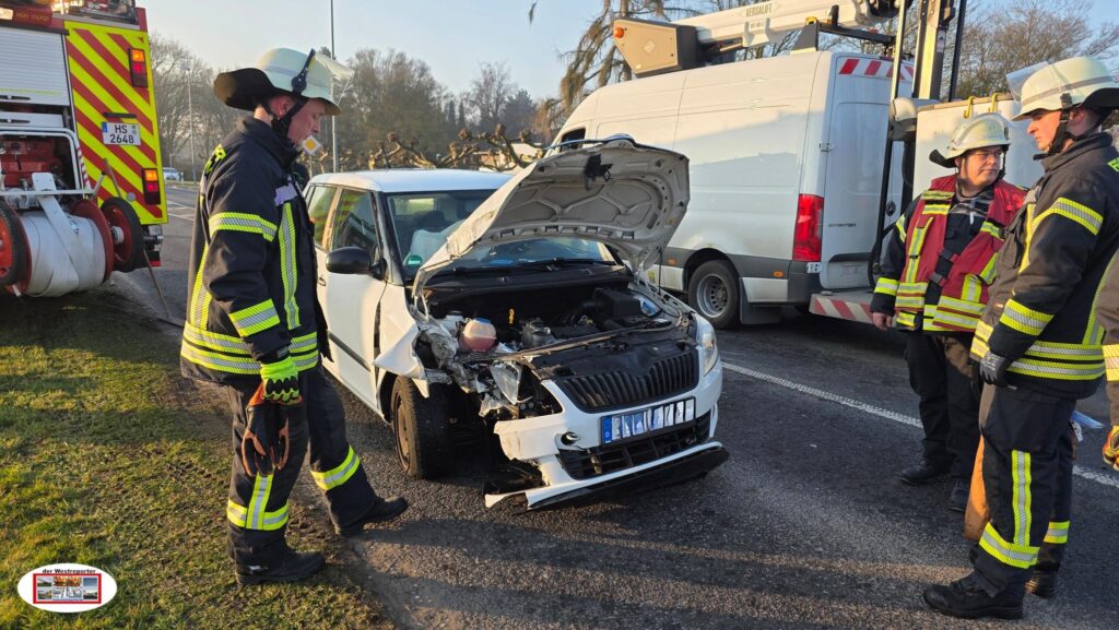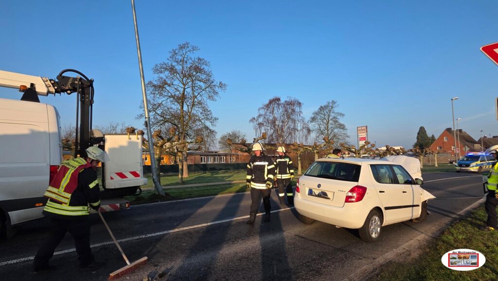Einsatzkräfte sicherten den Gefahrenbereich, stellten den Brandschutz sicher und streuten auslaufende Betriebsmittel ab. Durch den Energieversorger wurde der Laternenmast gesichert.