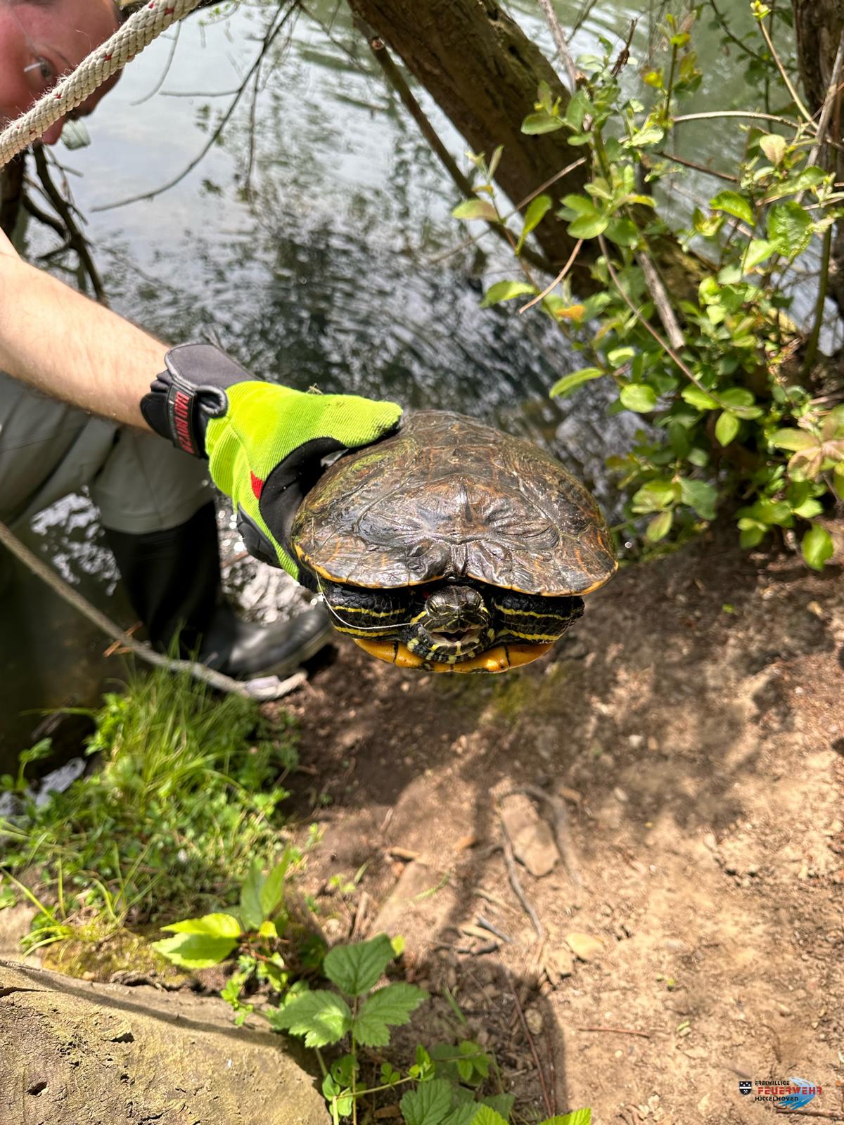 Einsatzbericht: Die Feuerwehr wurde zu einem „Kleintier in Not“ alarmiert. Laut Anrufer hatte dieser eine verletzte Schmuckschildkröte aufgefunden, die sich in einer Schnur verfangen und vermutlich einen Angelhaken verschluckt hatte.