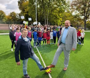 An der Junkerstraße in Hückelhoven-Doveren ist ein neues Kunstrasen-Kleinspielfeld ab sofort nutzbar. Bürgermeister Bernd Jansen (Foto re.) und der Vorsitzende des Schulausschusses Fredi Nießen nahmen den symbolischen ersten Anstoß vor. Danach wurde das Spielfeld direkt mit einem fröhlichen Fußballspiel der Grundschulkinder eingeweiht.