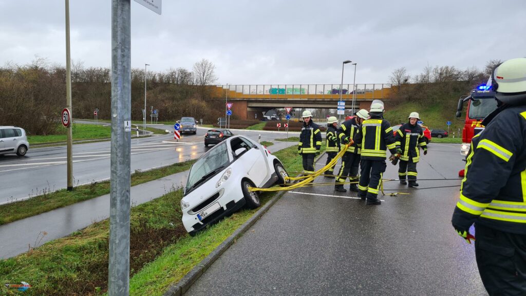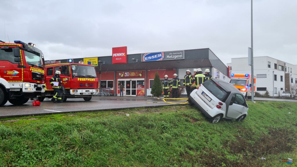 Die Feuerwehr wurde heute Vormittag gegen 11:30 Uhr zu einer Hilfeleistung nach Millich auf die Gronewaldstr. alarmiert. Auf dem Parkplatz eines Lebensmittel Discounters war aus ungeklärten Gründen ein Fahrzeug in den abschüssigen Hang gefahren und drohte umzustürzen.
