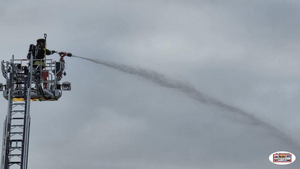 Die Einsatzkräfte unterstützten die Erkelenzer Kräfte bei der Brandbekämpfung mit der Drehleiter.