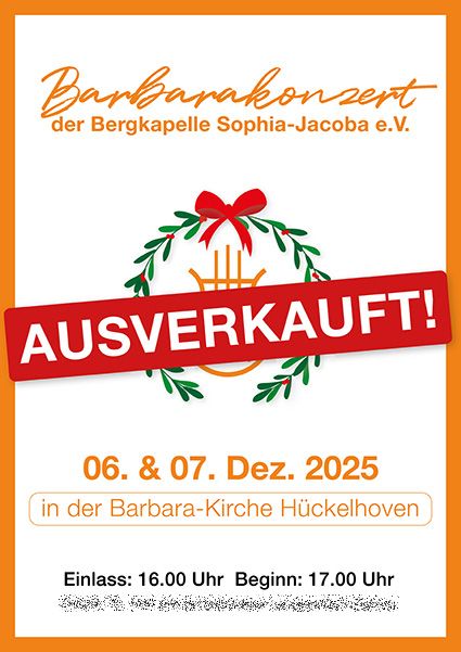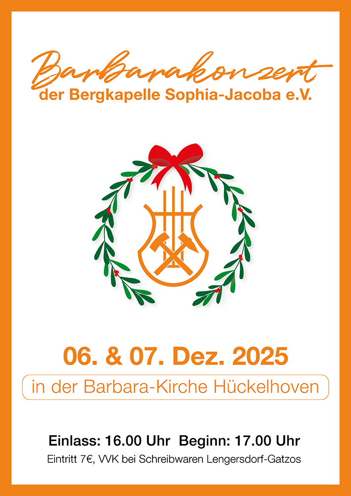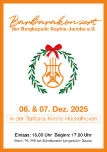 Freuen Sie sich auf ein vorweihnachtliches Konzertprogramm unter der Leitung unseres Dirigenten Rolf Deckers. Die Veranstaltung ist traditionell der Heiligen Barbara, Schutzpatronin der Bergleute, gewidmet.