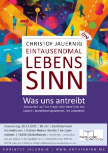 Am 20. November 2025 um 19:00 Uhr ist wieder der Multimediale Erzähler Christof Jauernig zu Gast in der Stadtbücherei Hückelhoven. Diesmal mit seinem neuen Programm „Eintausendmal Lebenssinn – Was uns antreibt“.