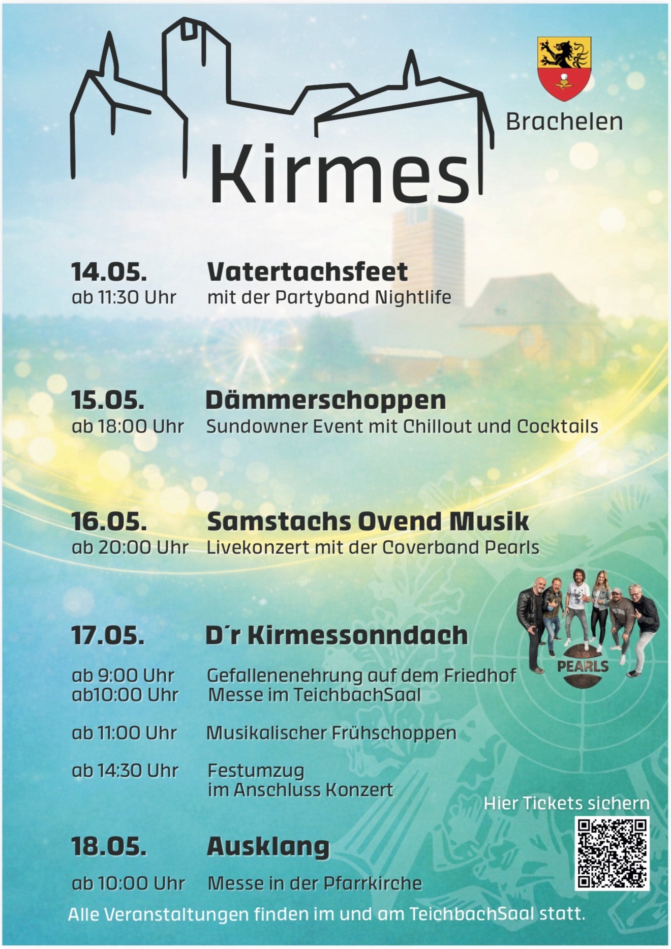 Die Frühkirmes in Brachelen findet in diesem Jahr vom 14. – 18. Mai 2026 statt. Die Kirmes beginnt mit der großen Vatertachsfeet auf Christi Himmelfahrt ab 11 Uhr mit Live-Musik der Coverband Nightlife. Am Freitag geht es mit einem Sundowner Event auf der Terrasse vom Teichbachsaal mit Cocktails und chilligen Beats weiter. Am Samstag ab 14 Uhr startet die Kirmes mit dem Familientag der Schausteller. Ab 18 Uhr folgt ein Umzug durch den Ort und anschließend der große Gala-Abend mit der Coverband Pearls. Am Sonntag ab 9 Uhr geht es dann weiter mit der Gefallenenehrung auf dem Friedhof und einer heiligen Messe im Teichbachsaal. Anschließend steht der Frühschoppen mit traditioneller Musik an. Ab 14.30 Uhr startet dann der große Umzug durch Brachelen. Der traditionelle Königsbaal findet im Anschluss im Teichbachsaal mit Open End statt. Der abschließende Montag beginnt dann mit der heiligen Messe um 10 Uhr und einer anschließenden Einkehr zum Frühschoppen in den Teichbachsaal.