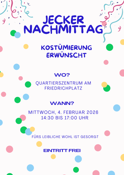 Das Team vom Quartiersmanagement veranstaltet am Mittwoch, den 4. Februar 2026 von 14:30-17:00 Uhr einen jecken Nachmittag für alle Besucher unseres Hauses.
