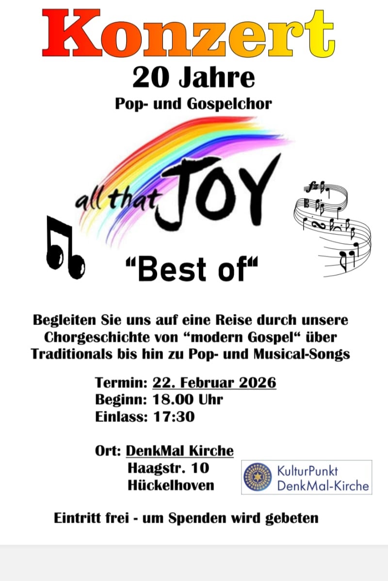 Wir begehen unser 20jähriges Chorjubiläum. Sie sind ❤️lich eingeladen mit uns zu feiern. Gospel, Pop und Musical erwarten sie. Der Eintritt ist frei, gefällt es ihnen sind Spenden willkommen.