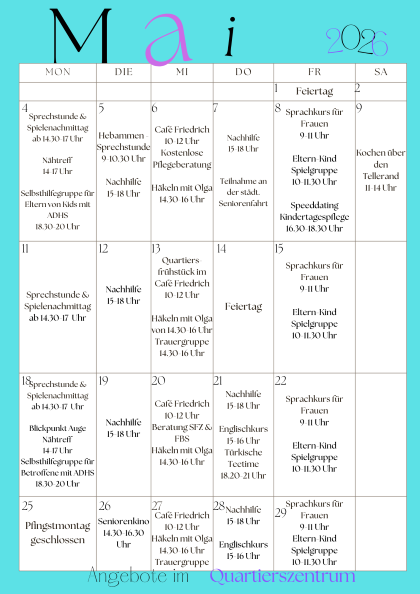Der Mai im Quartierszentrum am Friedrichplatz steht ganz im Zeichen lebendiger Nachbarschaft und offener Begegnungen.